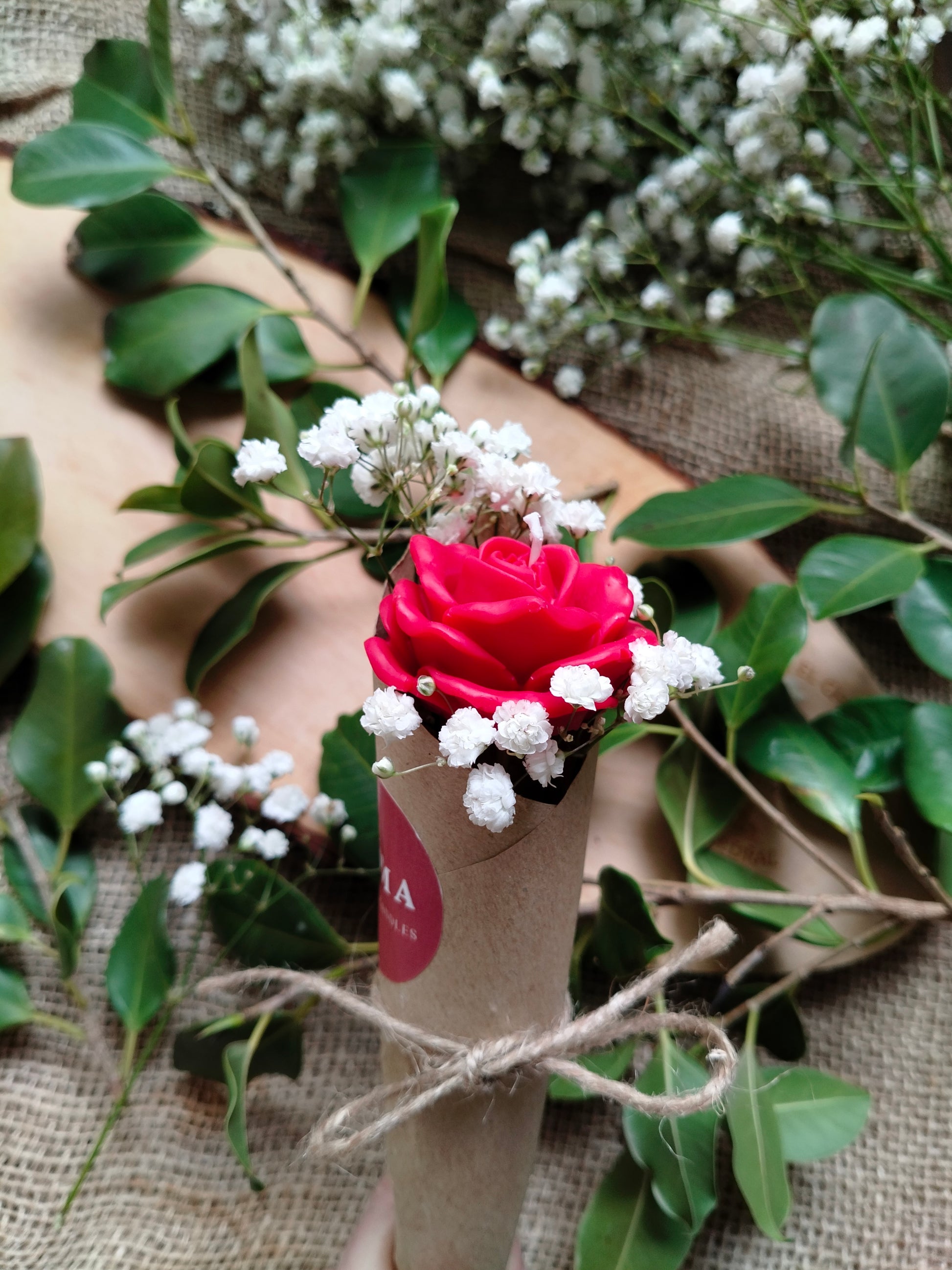 Presentada en un formato rústico-chic, envuelta en papel kraft y abrazada por paniculata blanca natural, esta pieza no necesita envoltorio: ella es el regalo.